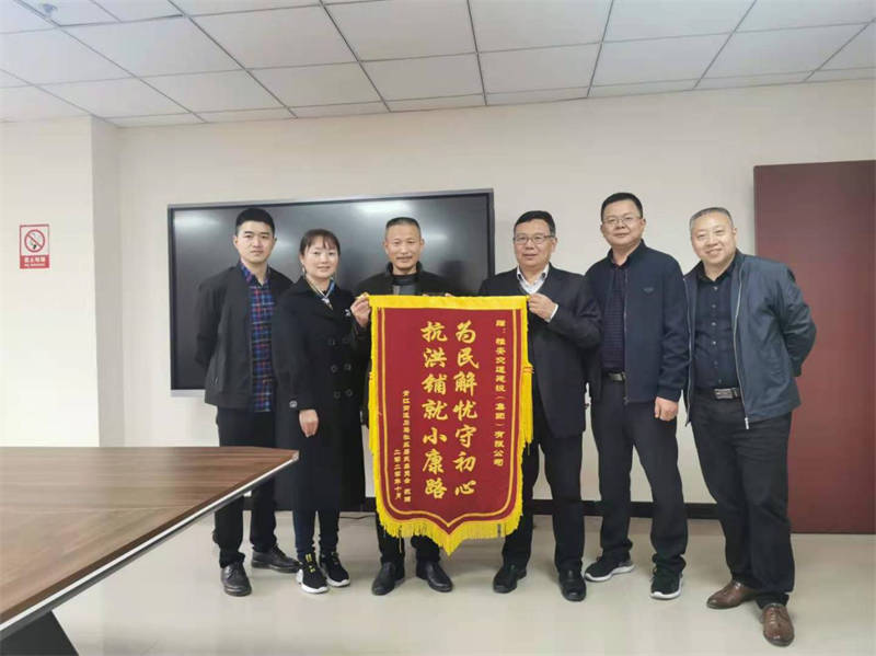 11月10日,雨城區(qū)青江街道石馬社區(qū)黨委書記楊述全、主任張世霞專程來到雅安交建集團,代表石馬社區(qū)群眾將寫有“為民解憂守初心·抗洪鋪就小康路”的錦旗贈送到交建集團黨委書記、董事長漆家華手中,為在今年8月抗洪搶險救災中交建集團對石馬社區(qū)給予的支持和幫助表示感謝。