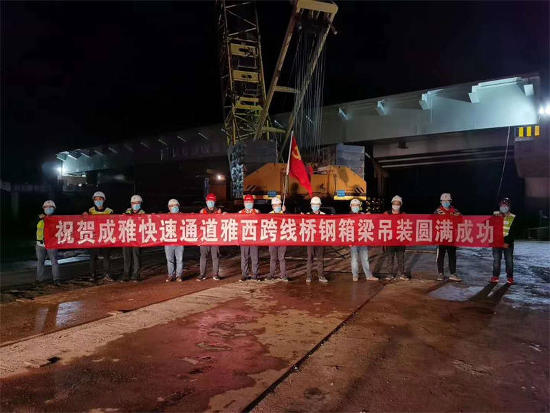 雅西跨線橋是成雅快速通道(雅安段)新建工程重要組成部分,該橋為單跨簡支鋼箱梁橋,全橋設(shè)計鋼箱梁4片,單片重量約140噸、長55余米,體積大、自身重、運輸困難,且投入的大型機械設(shè)備較多,施工組織難度大。為順利完成架設(shè)任務(wù),市交通局會同市交建集團(tuán)、交建項目管理公司、市公安局交警支隊和各參建單位多次組織召開專題會議,提前謀劃、細(xì)致安排、優(yōu)化組織,制定了施工專項方案和應(yīng)急措施,使整個施工過程按照標(biāo)準(zhǔn)化、程序化、規(guī)范化進(jìn)行施工,為鋼箱梁的成功吊裝奠定了堅實的基礎(chǔ)。