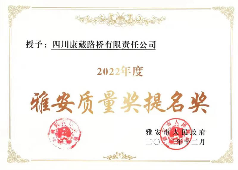 近日,雅安市人民政府根據(jù)《雅安質(zhì)量獎評審管理辦法》相關(guān)規(guī)定,公布了“2022 年度雅安質(zhì)量獎”,交建路橋榮獲“2022 年度雅安質(zhì)量獎提名獎”稱號。