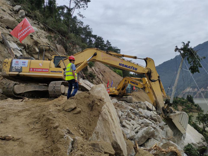 搶險(xiǎn)隊(duì)伍,馬上出發(fā)!集團(tuán)領(lǐng)導(dǎo)班子立即召開碰頭會(huì),分析研判形勢(shì),安排部署工作,密切關(guān)注震區(qū)態(tài)勢(shì),成立抗震救災(zāi)領(lǐng)導(dǎo)小組,副總經(jīng)理鐘焱宇率現(xiàn)場(chǎng)指揮組趕赴石棉靠前指揮搶險(xiǎn)救災(zāi)。正在石棉G108線施工的康藏路橋公司項(xiàng)目部組成10人搶險(xiǎn)救援小分隊(duì),攜帶挖掘機(jī)4臺(tái)、拖車4臺(tái)、裝載機(jī)3臺(tái)、交通運(yùn)輸車2輛、無(wú)人機(jī)1臺(tái),第一時(shí)間到就地?fù)岆U(xiǎn)工作,震后7小時(shí),完成國(guó)道G108線馬富至菩薩崗約40公里路段、6處塌方點(diǎn)1600余方土石方清理,爾后轉(zhuǎn)戰(zhàn)石棉縣新民鄉(xiāng)進(jìn)行通鄉(xiāng)道路搶通作業(yè)。