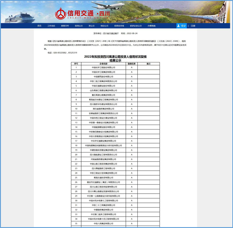 近日,四川省交通運(yùn)輸廳“信用交通(四川)”公示2022年擬投資四川省高速公路投資人信用狀況復(fù)核結(jié)果和2022年第3批擬投資四川省高速公路投資人初次信用評價(jià)結(jié)果,雅安市交通建設(shè)(集團(tuán))有限責(zé)任公司及下屬全資子公司四川康藏路橋有限責(zé)任公司獲得“A”級信用評價(jià)。