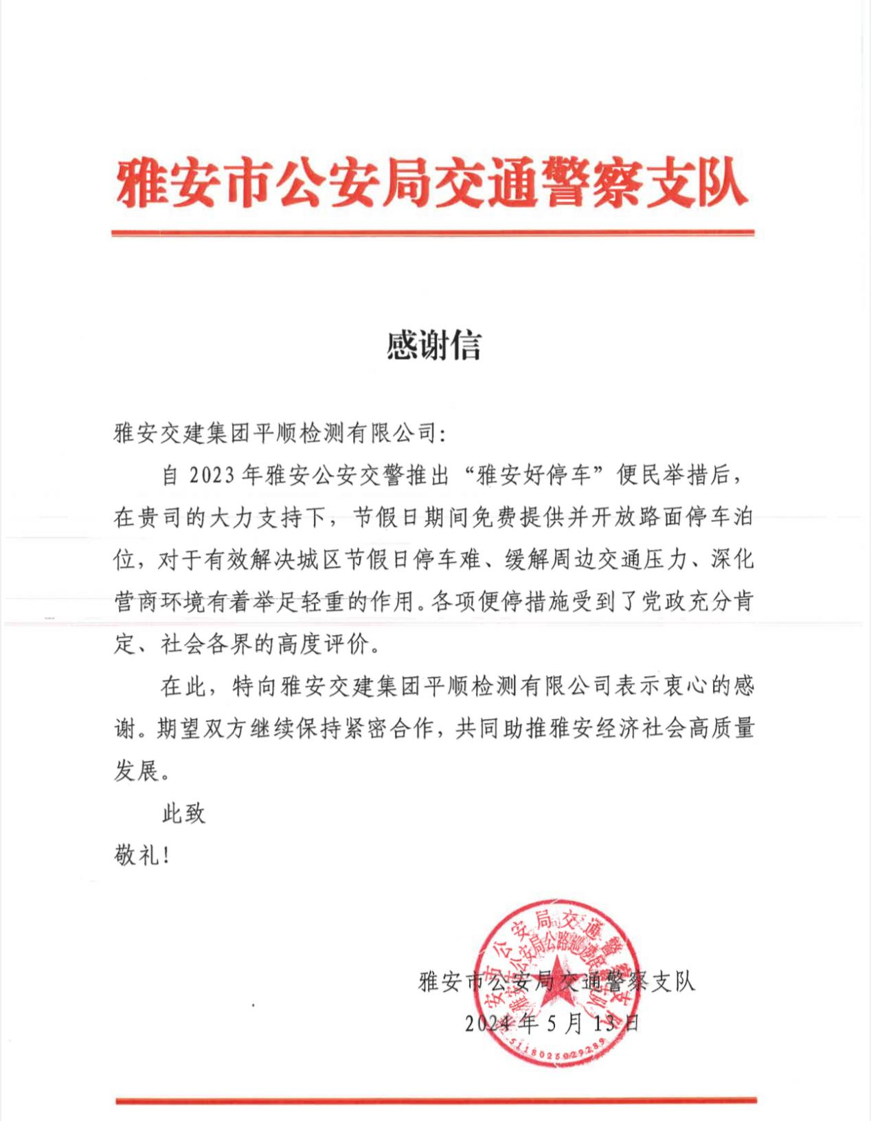 近日,雅安交建集團(tuán)平順公司收到一封來自雅安市公安局交通警察支隊(duì)的感謝信,對(duì)平順公司積極響應(yīng)雅安公安交警“雅安好停車”便民措施,在節(jié)假日期間免費(fèi)提供并開放路面停車泊位表示感謝。