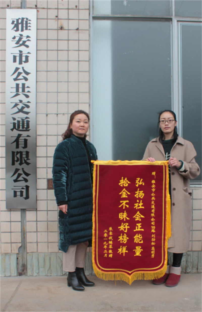 “請一定把我們的感謝帶給駕駛員和發(fā)班員。”2月14日下午17時15分左右,一名手拿寫著“拾金不昧好榜樣弘揚(yáng)社會正能量”錦旗的市民錢續(xù)露來到雅安市公共交通有限公司,將錦旗送到了經(jīng)理助理方媛手上,請她把感謝之意轉(zhuǎn)達(dá)給10路公交車駕駛員劉進(jìn)松和發(fā)班員高胡秀。