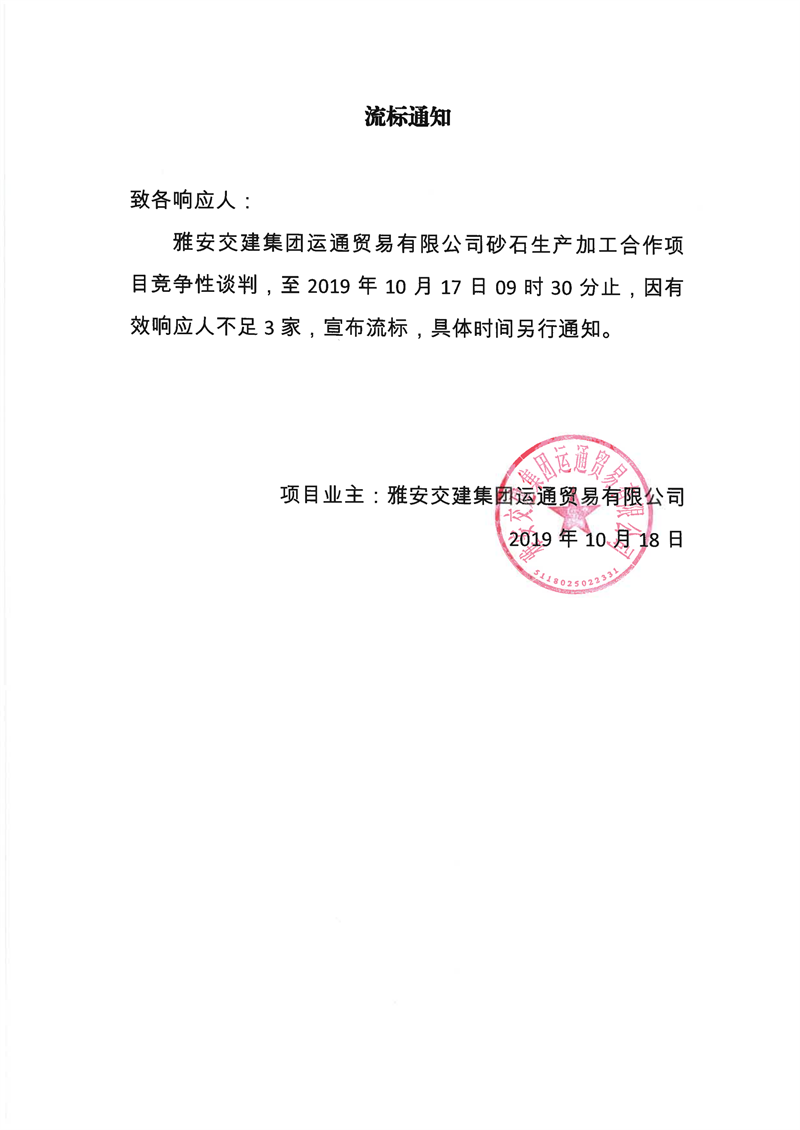 雅安交建集團(tuán)運(yùn)通貿(mào)易有限公司砂石生產(chǎn)加工合作項目流標(biāo)通知