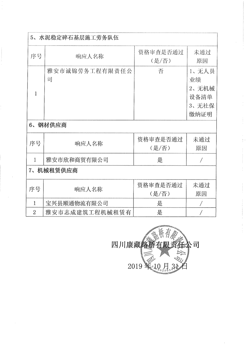四川康藏路橋有限責任公司企業(yè)入庫比選(補錄)結果公示