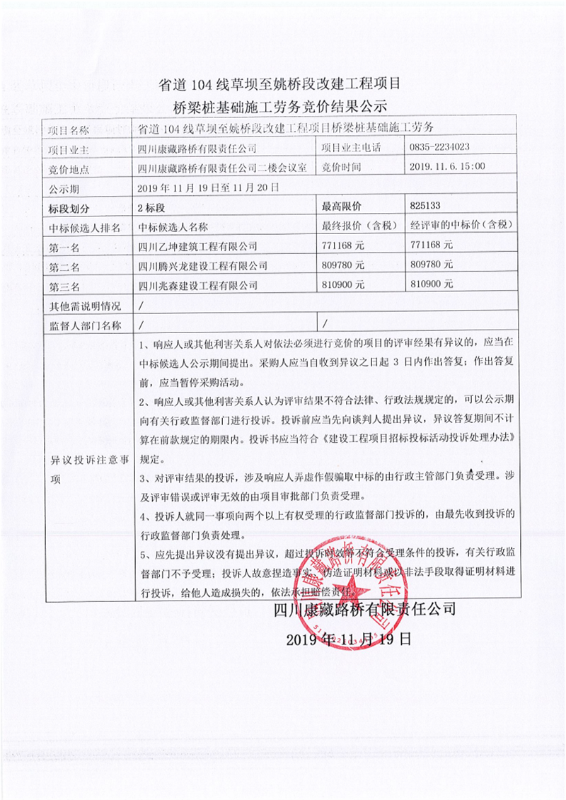 四川康藏路橋有限責(zé)任公司省道104線草壩至姚橋段改建工程項(xiàng)目橋梁樁基礎(chǔ)施工勞務(wù)競(jìng)價(jià)(2標(biāo)段)結(jié)果公示