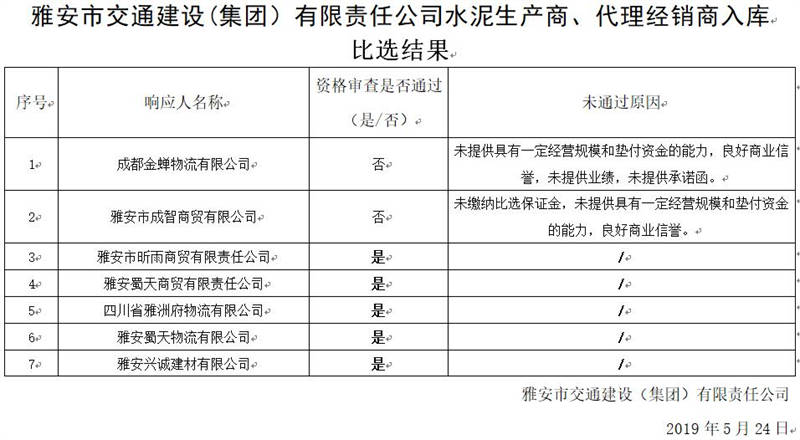 雅安市交通建設(shè)(集團(tuán))有限責(zé)任公司水泥生產(chǎn)商、代理經(jīng)銷商入庫(kù)比選結(jié)果公示