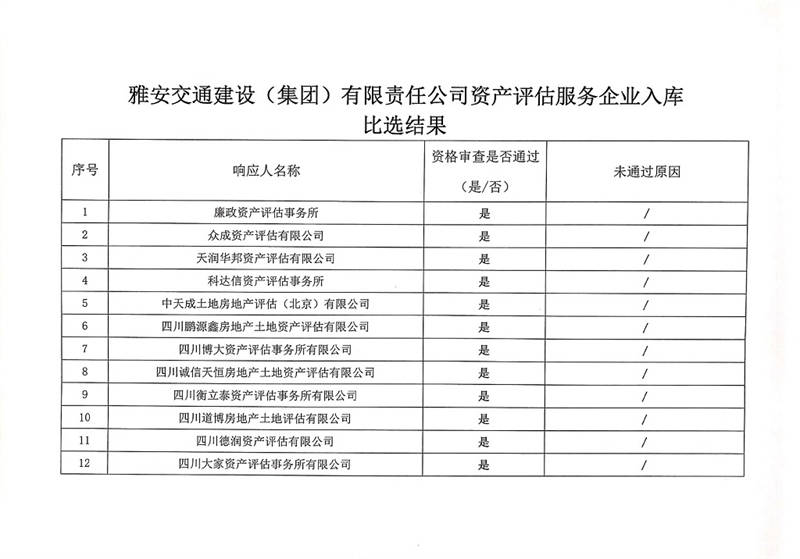 雅安交通建設(shè)(集團(tuán))有限責(zé)任公司資產(chǎn)評估服務(wù)企業(yè)入庫比選結(jié)果
