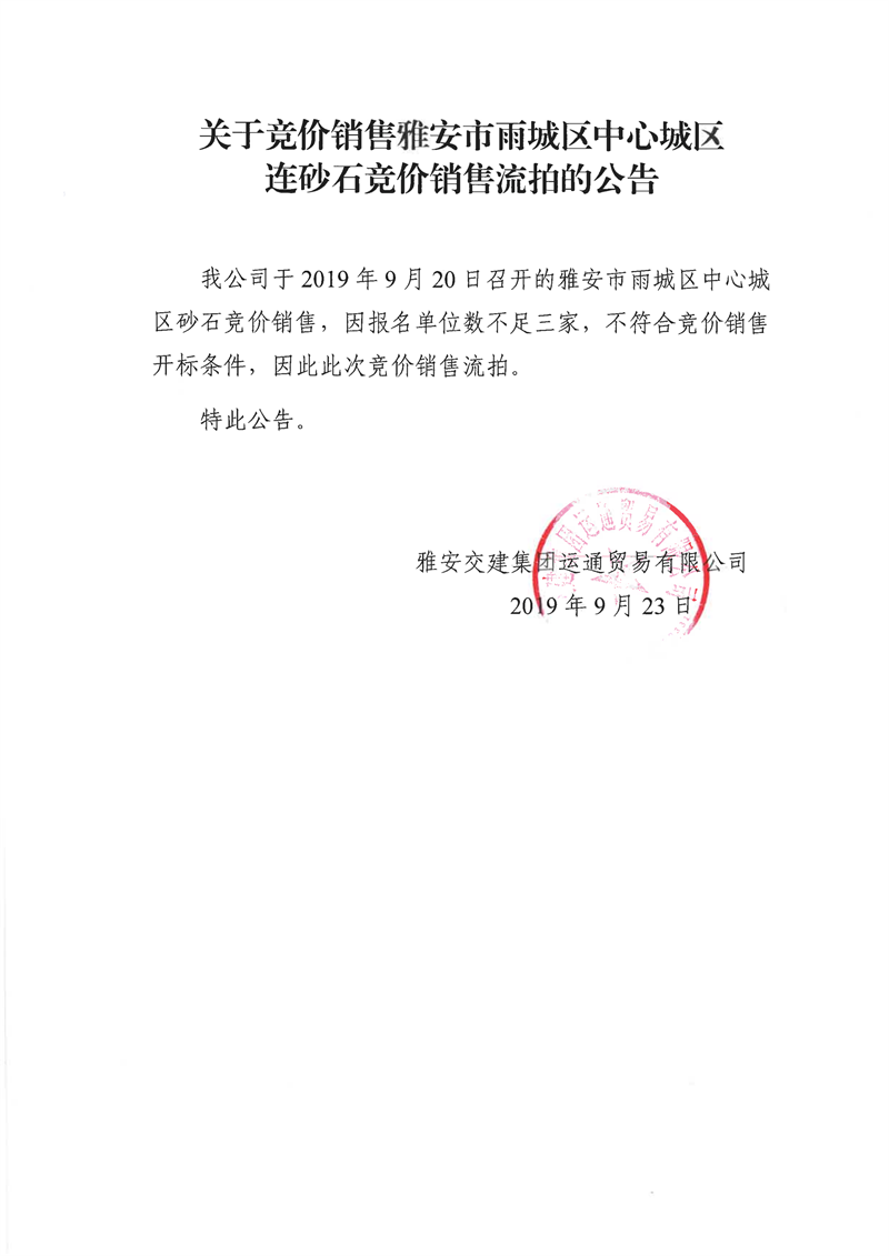 雅安交建集團(tuán)運(yùn)通貿(mào)易有限公司關(guān)于競(jìng)價(jià)銷售雅安市雨城區(qū)中心城區(qū)連砂石競(jìng)價(jià)銷售流拍的公告