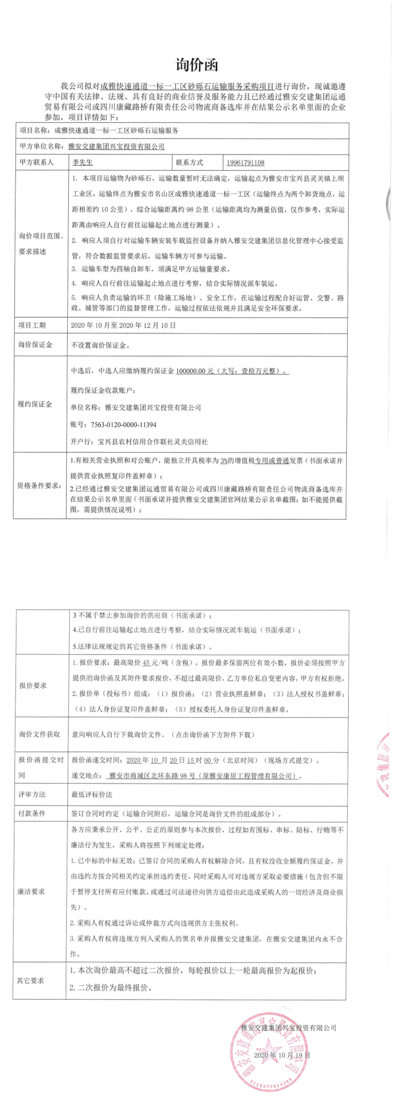 雅安交建集團(tuán)興寶投資有限公司成雅快速通道一標(biāo)一工區(qū)砂礫石運(yùn)輸服務(wù)采購(gòu)項(xiàng)目詢價(jià)函