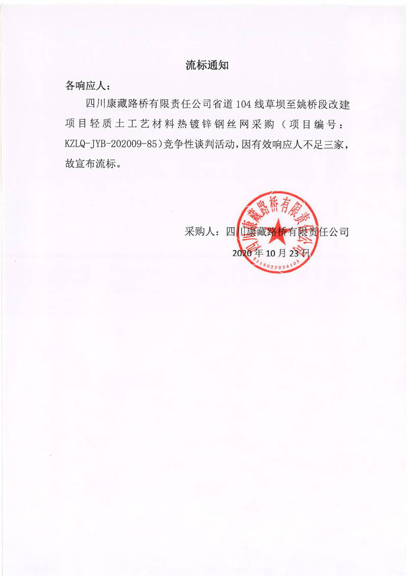 四川康藏路橋有限責(zé)任公司省道104線草壩至姚橋段改建項目輕質(zhì)土工藝材料熱鍍鋅鋼絲網(wǎng)采購項目流標通知