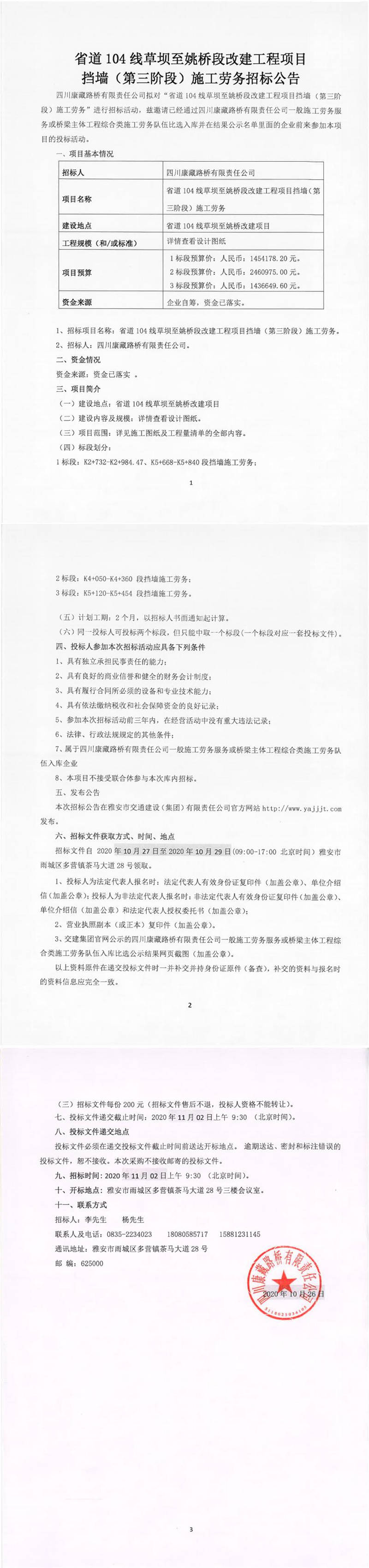 四川康藏路橋有限責(zé)任公司省道104線草壩至姚橋段改建工程項(xiàng)目擋墻(第三階段)施工勞務(wù)招標(biāo)公告