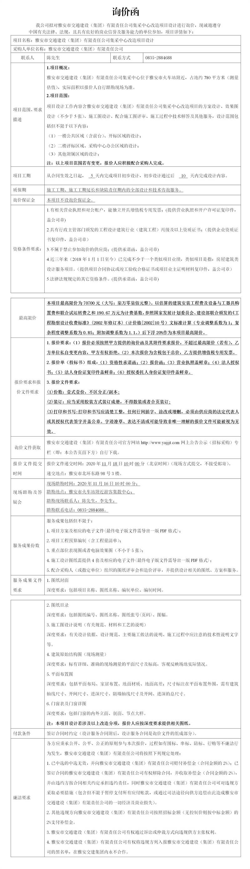 雅安市交通建設(shè)(集團(tuán))有限責(zé)任公司集采中心改造項(xiàng)目設(shè)計(jì)詢(xún)價(jià)公告