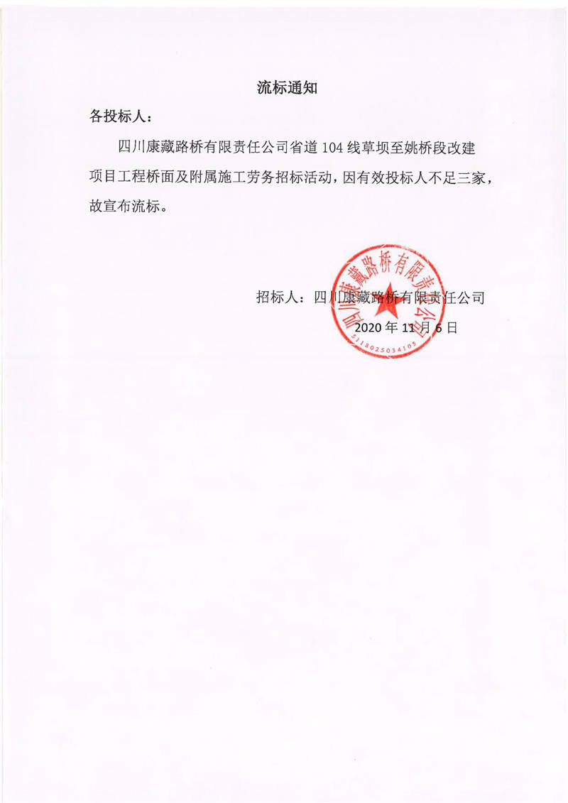 四川康藏路橋有限責任公司省道104線草壩至姚橋段改建項目工程橋面及附屬施工勞務(wù)流標通知