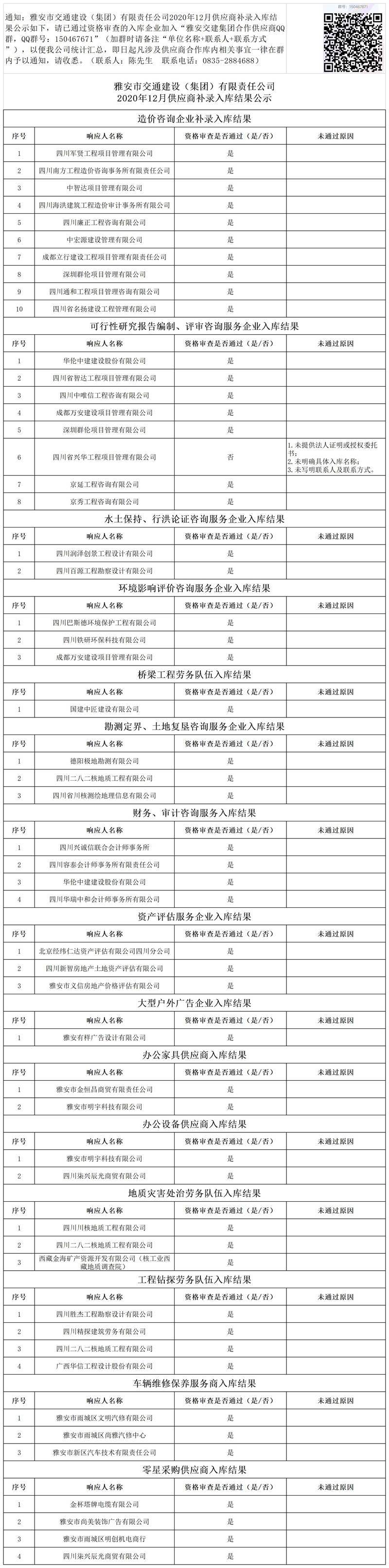 雅安市交通建設(shè)(集團(tuán))有限責(zé)任公司2020年12月供應(yīng)商補錄入庫結(jié)果公示