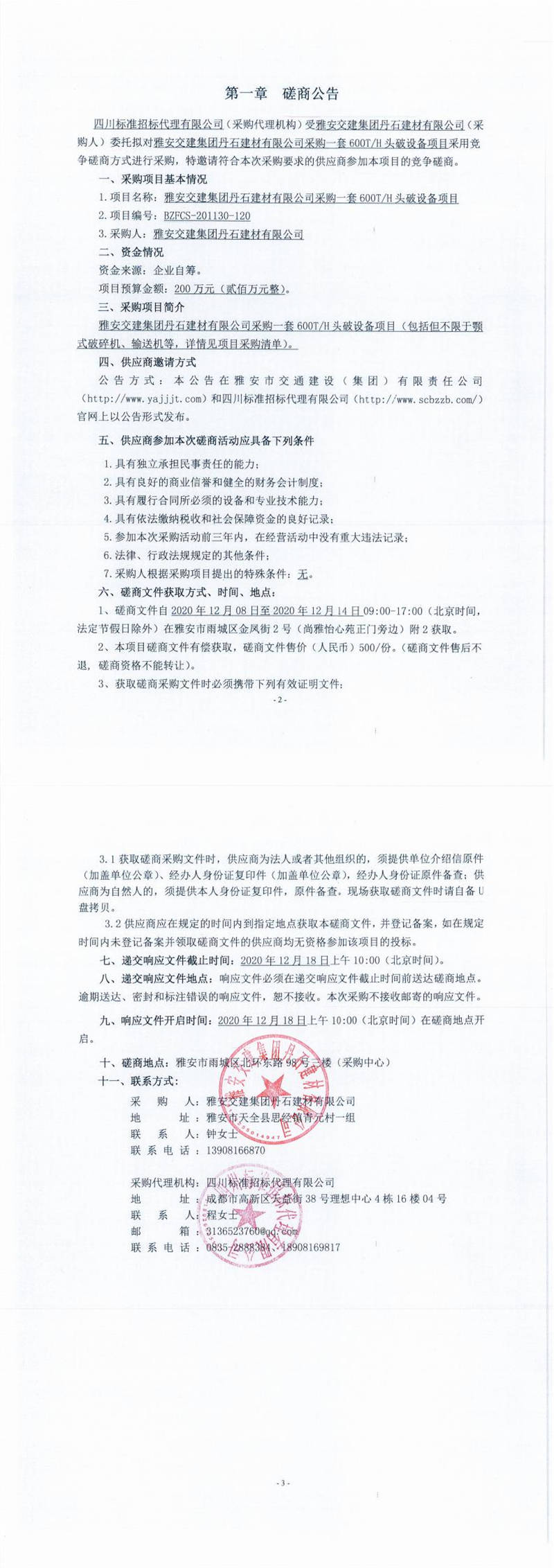 雅安交建集團(tuán)丹石建材有限公司采購一套600T/H頭破設(shè)備項(xiàng)目磋商公告