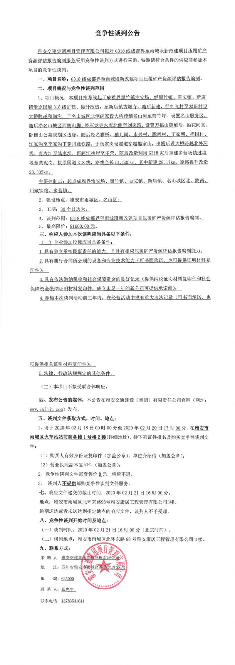 雅安交建集團(tuán)項(xiàng)目管理有限公司G318線成都界至雨城段新改建項(xiàng)目壓覆礦產(chǎn)資源評(píng)估報(bào)告編制競爭性談判公告