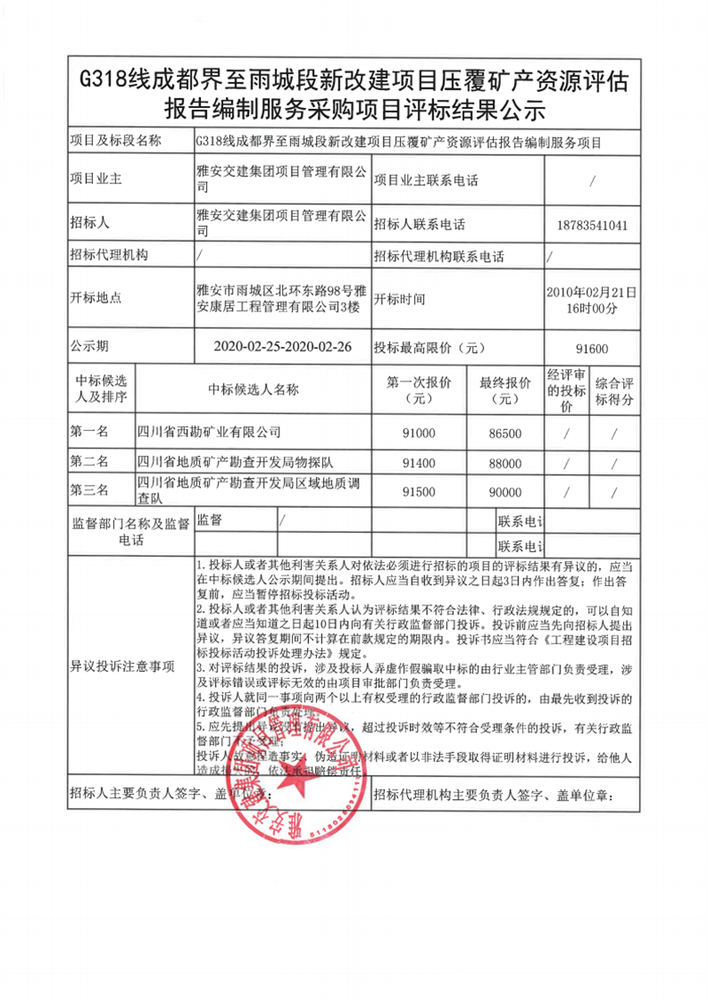 雅安交建集團(tuán)項(xiàng)目管理有限公司G318線成都界至雨城段新改建項(xiàng)目壓覆礦產(chǎn)資源評估報(bào)告編制服務(wù)采購項(xiàng)目評標(biāo)結(jié)果公示