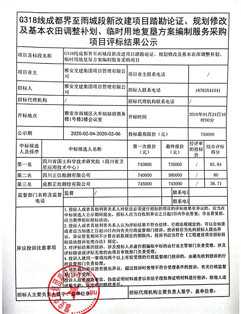 雅安交建集團項目管理有限公司G318線成都界至雨城段新改建項目踏勘論證、規(guī)劃修改及基本農(nóng)田調(diào)整補劃、臨時用地復(fù)墾方案編制服務(wù)采購項目評標(biāo)結(jié)果公示