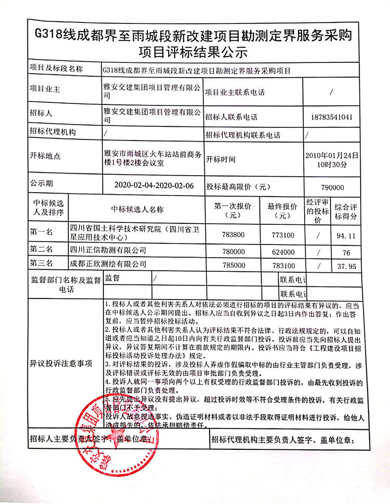 雅安交建集團(tuán)項(xiàng)目管理有限公司G318線(xiàn)成都界至雨城段新改建項(xiàng)目勘測(cè)定界服務(wù)采購(gòu)項(xiàng)目評(píng)標(biāo)結(jié)果公示