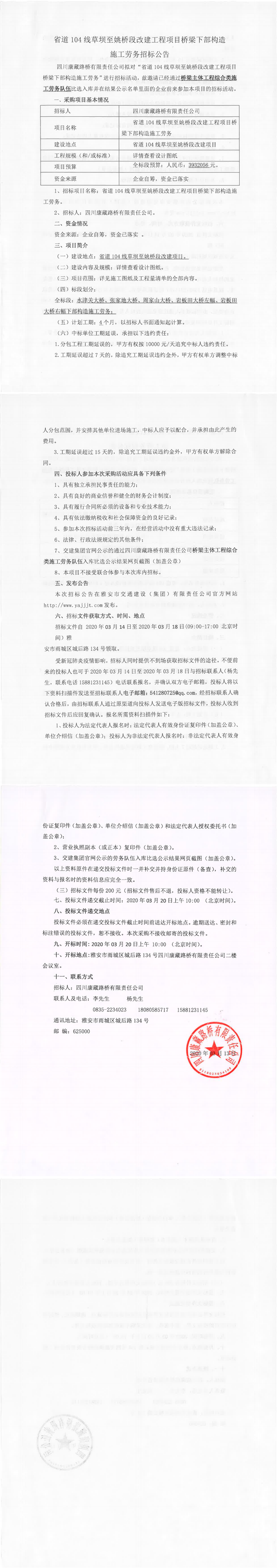 四川康藏路橋有限責(zé)任公司省道104線草壩至姚橋段改建工程項目橋梁下部構(gòu)造施工勞務(wù)招標公告