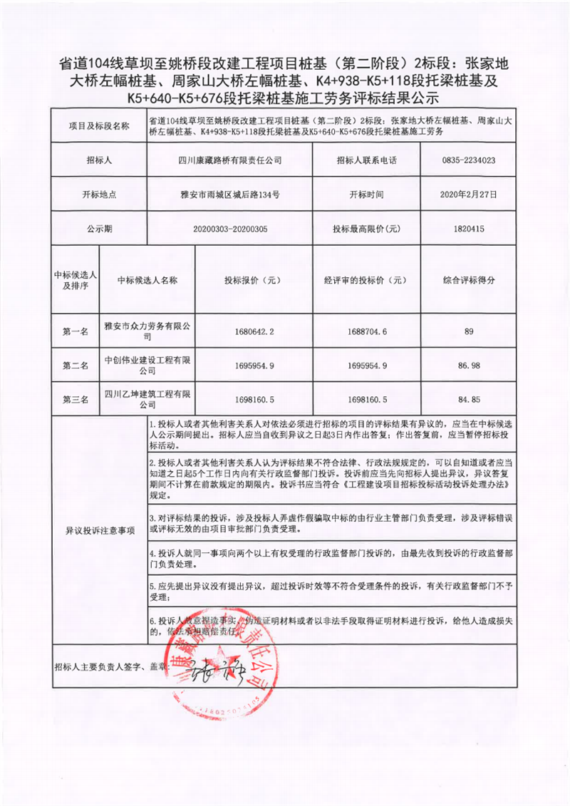 四川康藏路橋有限責(zé)任公司省道104線草壩至姚橋段改建工程項目擋墻(第二階段)1標(biāo)段:K1+900-K4+050施工勞務(wù)評標(biāo)結(jié)果公示