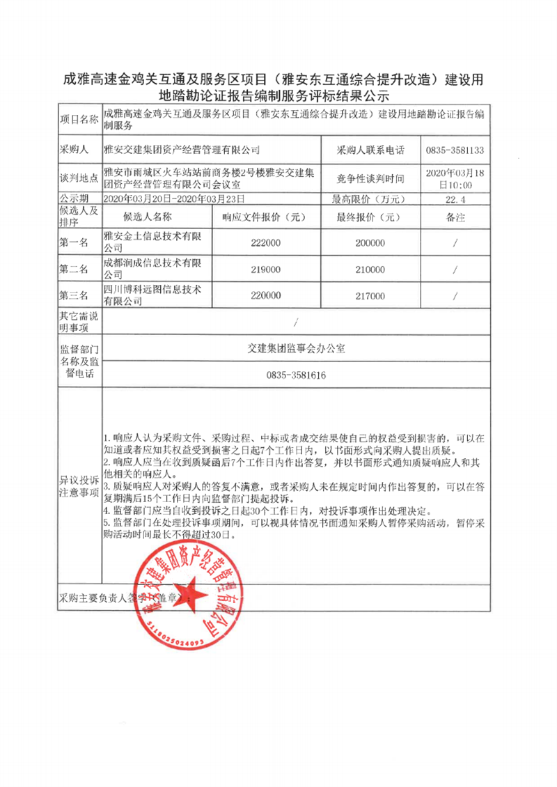 雅安交建集團資產(chǎn)經(jīng)營管理有限公司成雅高速金雞關(guān)互通及服務(wù)區(qū)項目(雅安東互通綜合提升改造)建設(shè)用地踏勘論證報告編制服務(wù)評標(biāo)結(jié)果公示