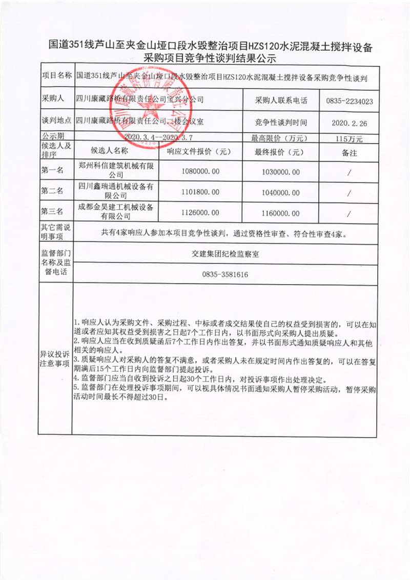 四川康藏路橋有限責(zé)任公司國(guó)道351線蘆山至夾金山埡口段水毀整治項(xiàng)目在建工程項(xiàng)目HZS120水泥混凝土攪拌設(shè)備采購(gòu)項(xiàng)目競(jìng)爭(zhēng)性談判結(jié)果公示