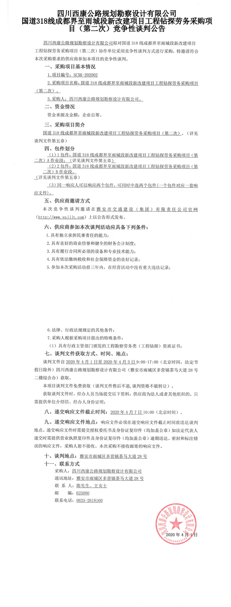 四川西康公路規(guī)劃勘察設(shè)計有限公司國道318線成都界至雨城段新改建項目工程鉆探勞務(wù)采購項目(第二次)競爭性談判公告