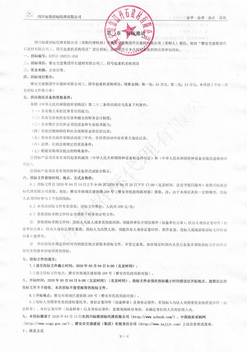 雅安交建集團丹石建材有限公司三、四號起重機采購項目招標公告