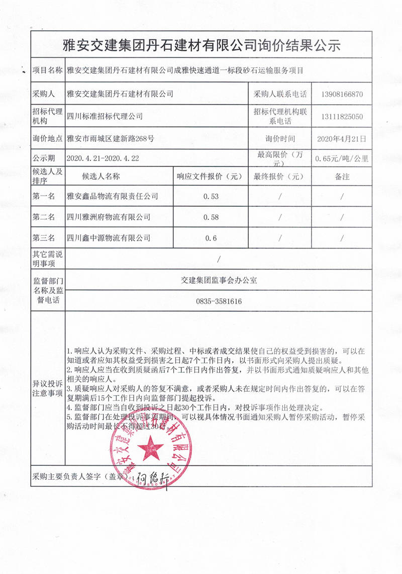 雅安交建集團(tuán)丹石建材有限公司成雅快速通道一標(biāo)段砂石運輸服務(wù)項目詢價結(jié)果公示