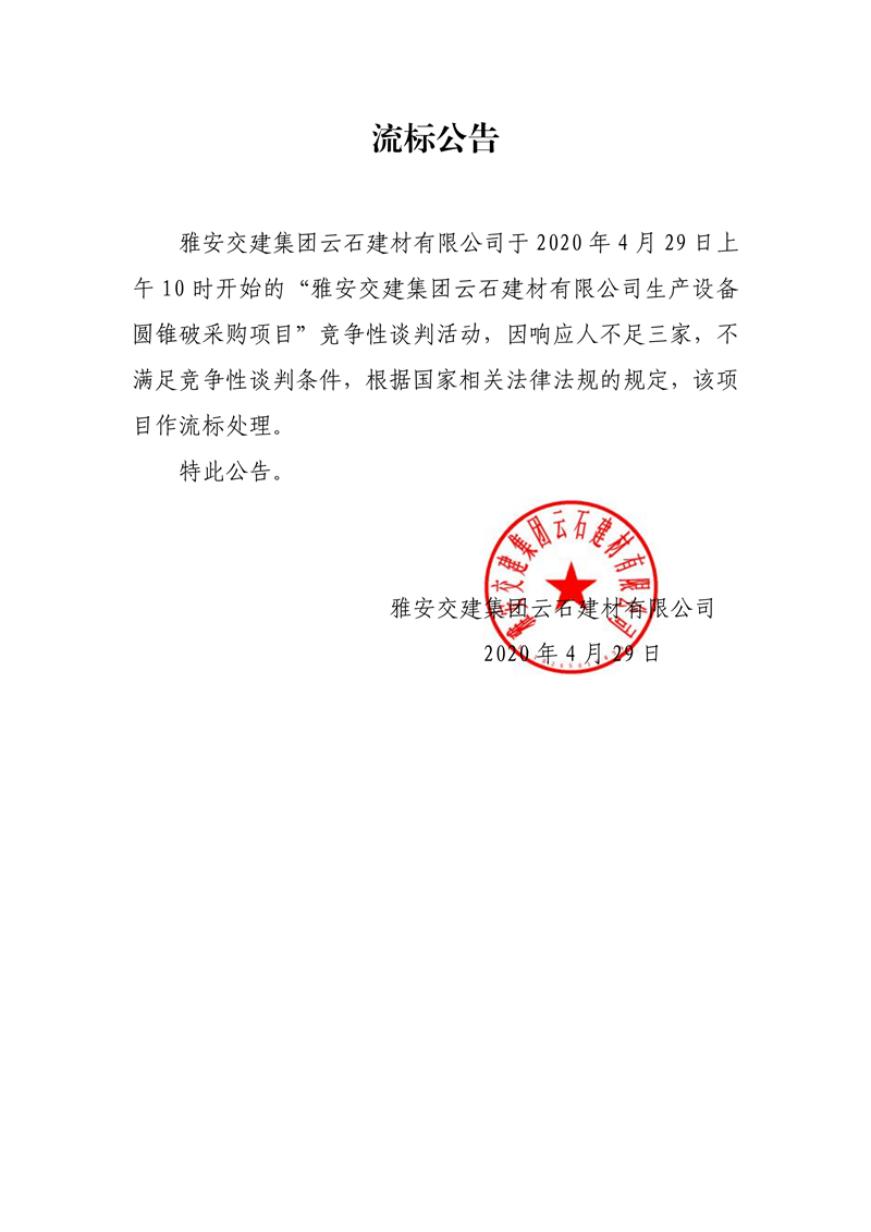 雅安交建集團云石建材有限公司生產(chǎn)設備圓錐破采購項目流標公告