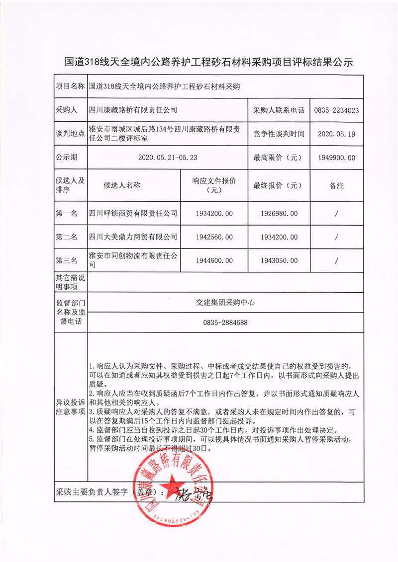 四川康藏路橋有限責(zé)任公司國道318線天全境內(nèi)公路養(yǎng)護(hù)工程砂石材料采購項(xiàng)目評(píng)標(biāo)結(jié)果公示