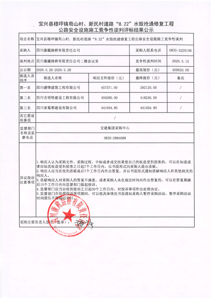 四川康藏路橋有限責(zé)任公司寶興縣穆坪鎮(zhèn)茍山村、新民村道路“8.22”水毀搶通修復(fù)工程公路安全設(shè)施施工競爭性談判評標結(jié)果公示