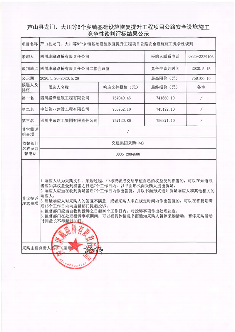 四川康藏路橋有限責任公司蘆山縣龍門、大川等8個鄉(xiāng)鎮(zhèn)基礎(chǔ)設(shè)施恢復提升工程項目公路安全設(shè)施施工競爭性談判評標結(jié)果公示