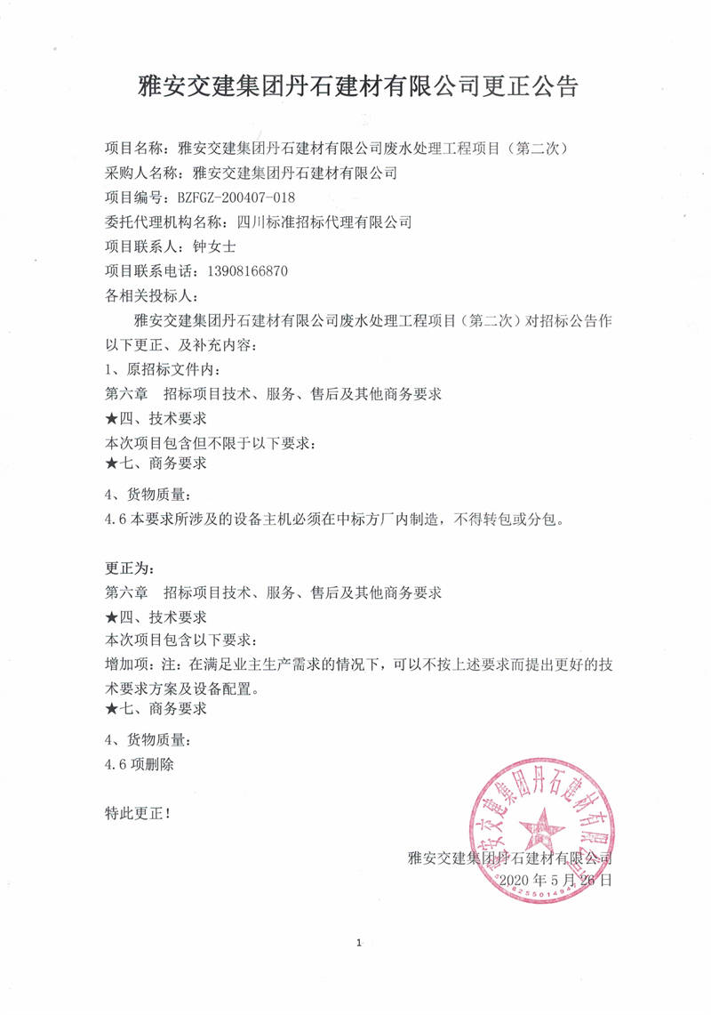 雅安交建集團丹石建材有限公司廢水處理工程項目(第二次)更正公告