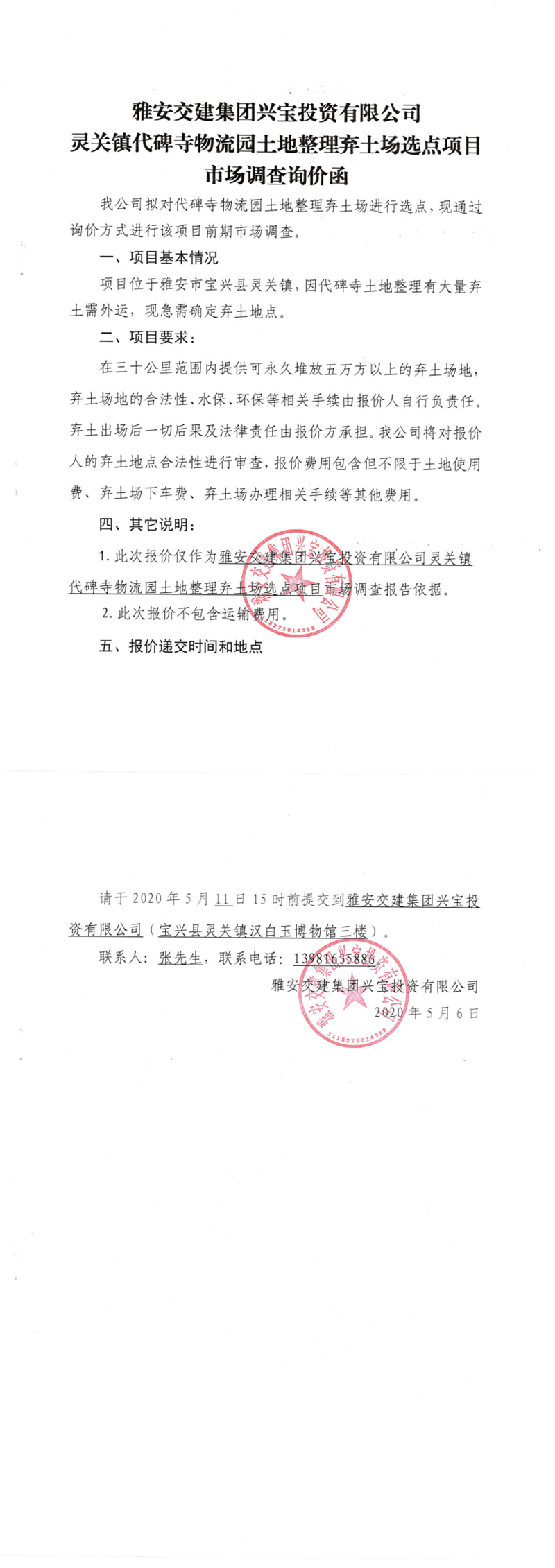 雅安交建集團興寶投資有限公司靈關(guān)鎮(zhèn)代碑寺物流園土地整理棄土場選點項目市場調(diào)查詢價函