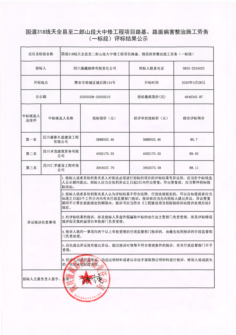 四川康藏路橋有限責(zé)任公司國道318線天全縣至二郎山段大中修工程項(xiàng)目路基、路面病害整治施工勞務(wù)(一標(biāo)段)評標(biāo)結(jié)果公示