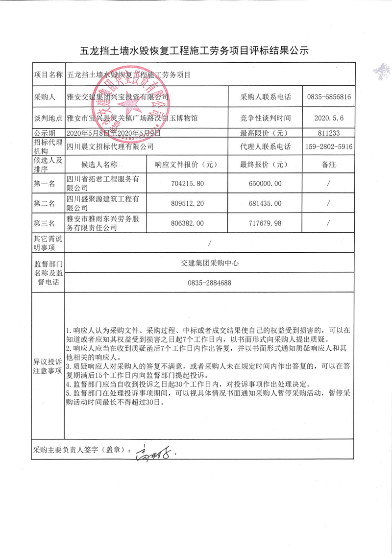 雅安交建集團(tuán)興寶投資有限公司五龍擋土墻水毀恢復(fù)工程施工勞務(wù)項(xiàng)目評(píng)標(biāo)結(jié)果公示