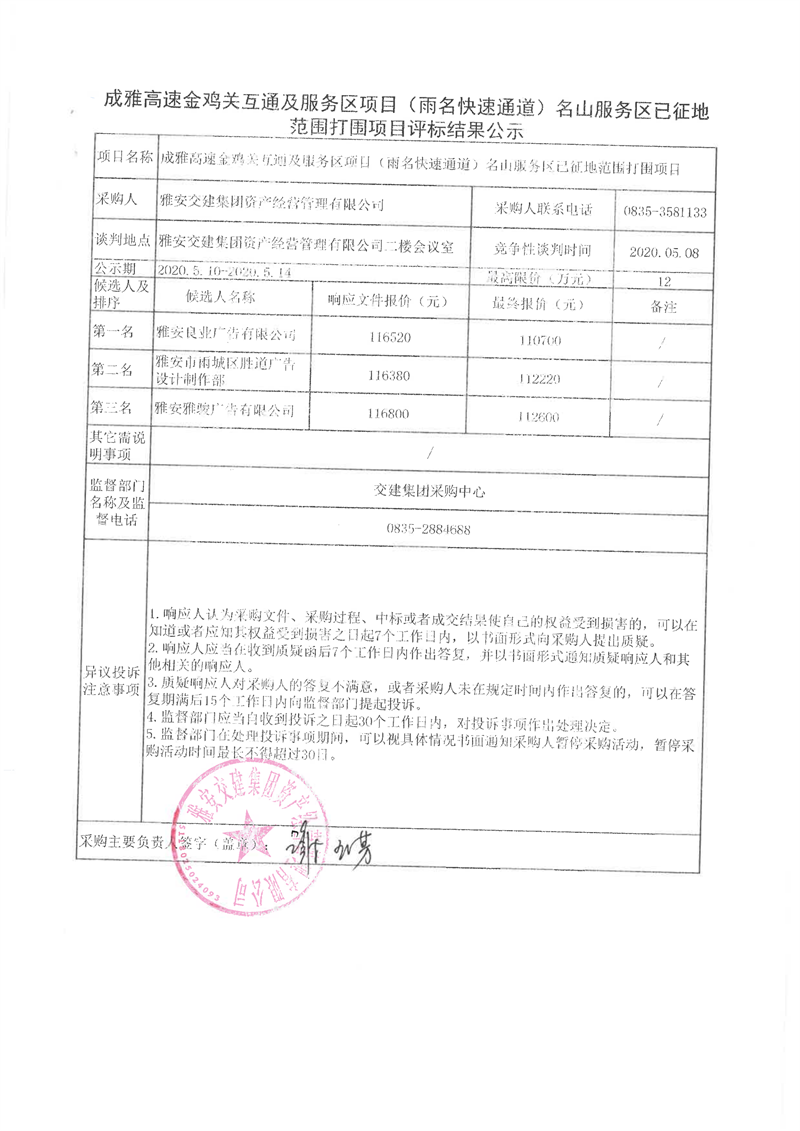 雅安交建集團(tuán)資產(chǎn)經(jīng)營管理有限公司成雅高速金雞關(guān)互通及服務(wù)區(qū)項目(雨名快速通道)名山服務(wù)區(qū)已征地范圍打圍項目評標(biāo)結(jié)果公示