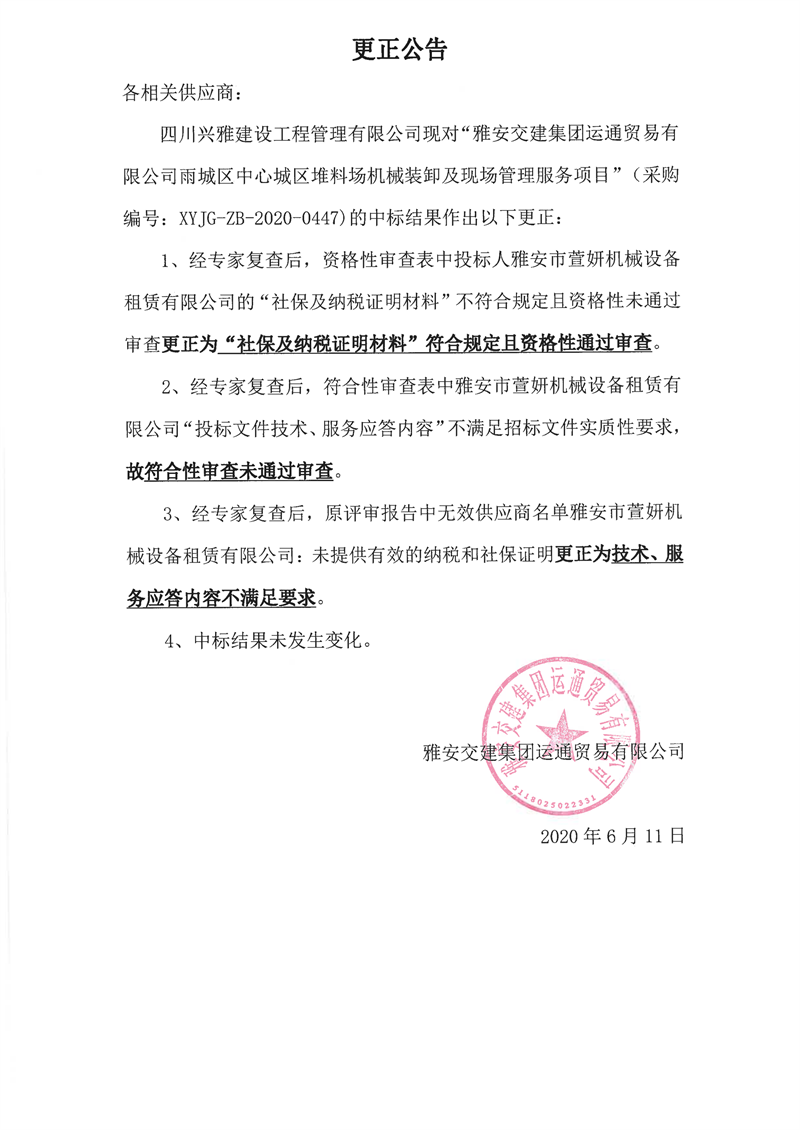 雅安交建集團(tuán)運(yùn)通貿(mào)易有限公司雨城區(qū)中心城區(qū)堆料場機(jī)械裝卸及現(xiàn)場管理服務(wù)項目更正公告