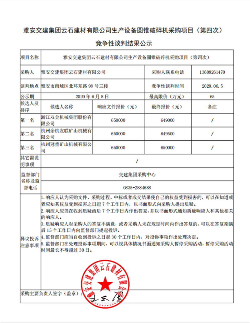 雅安交建集團(tuán)云石建材有限公司生產(chǎn)設(shè)備圓錐破碎機(jī)采購項目(第四次)競爭性談判結(jié)果公示