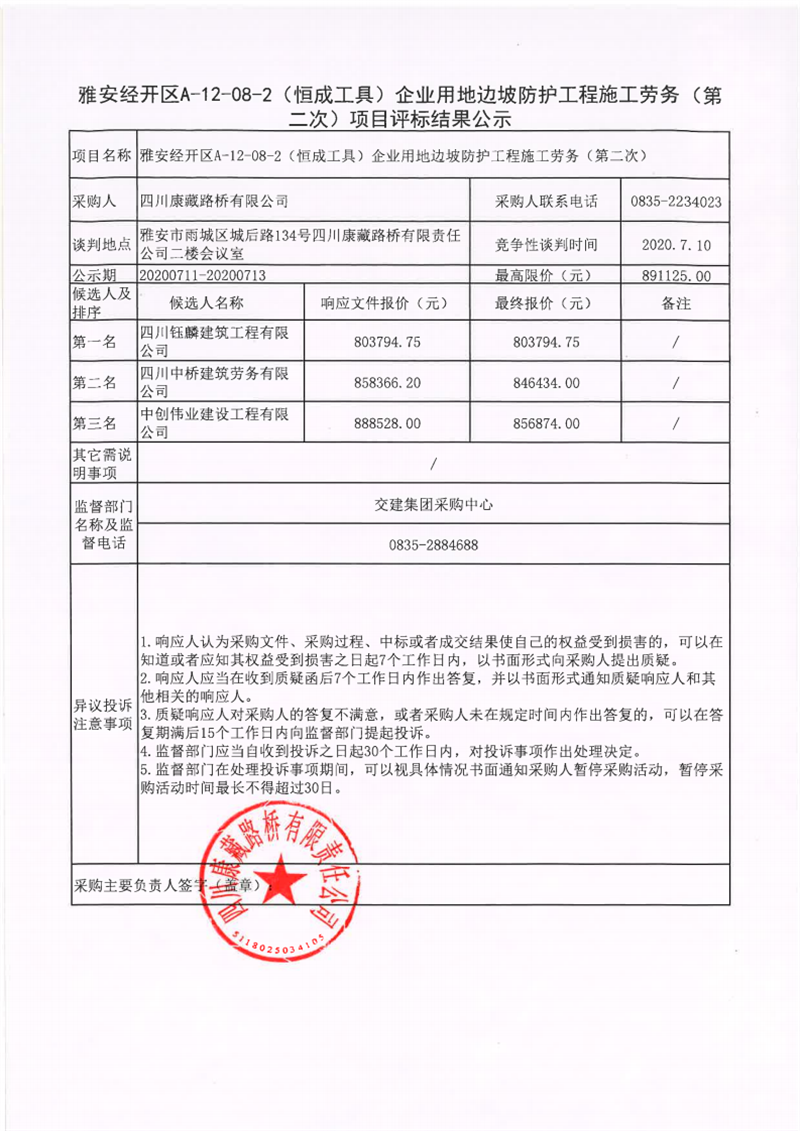 四川康藏路橋有限公司雅安經(jīng)開(kāi)區(qū)A-12-08-2(恒成工具)企業(yè)用地邊坡防護(hù)工程施工勞務(wù)(第二次)項(xiàng)目評(píng)標(biāo)結(jié)果公示