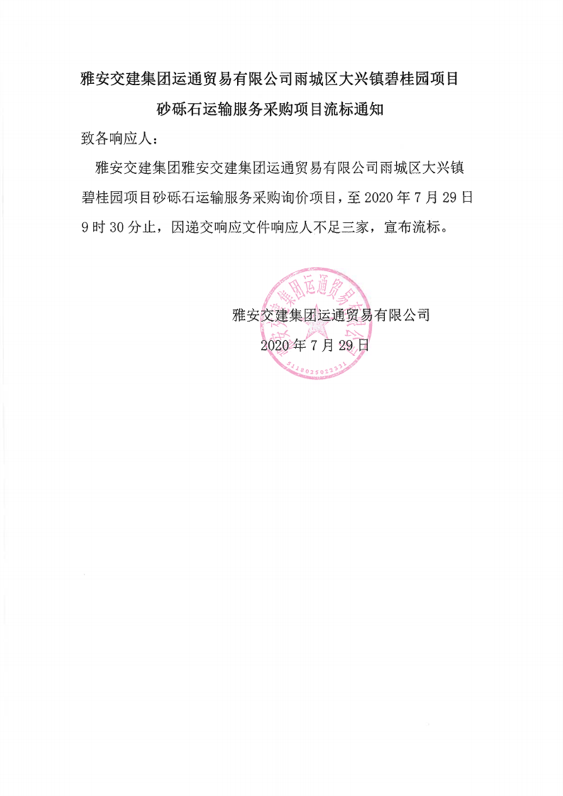 雅安交建集團(tuán)運(yùn)通貿(mào)易有限公司雨城區(qū)大興鎮(zhèn)碧桂園砂礫石運(yùn)輸服務(wù)采購項目流標(biāo)通知