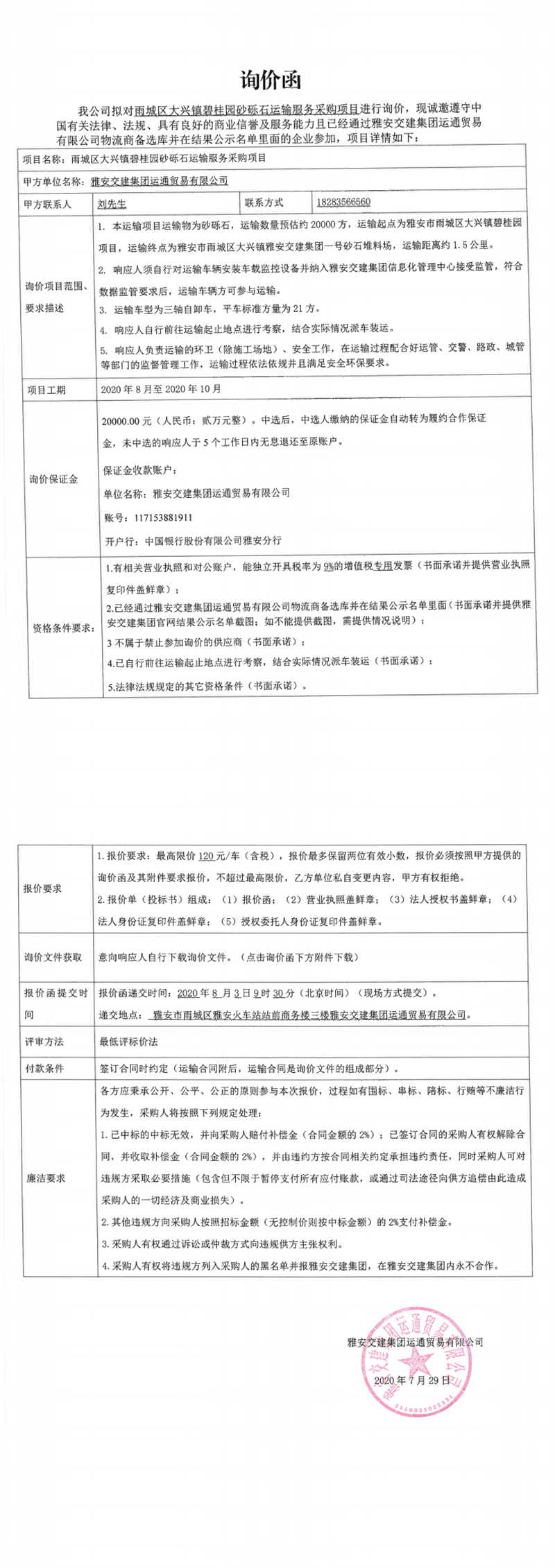 雅安交建集團(tuán)運(yùn)通貿(mào)易有限公司雨城區(qū)大興鎮(zhèn)碧桂園砂礫石運(yùn)輸服務(wù)采購(gòu)項(xiàng)目(第二次)詢(xún)價(jià)函