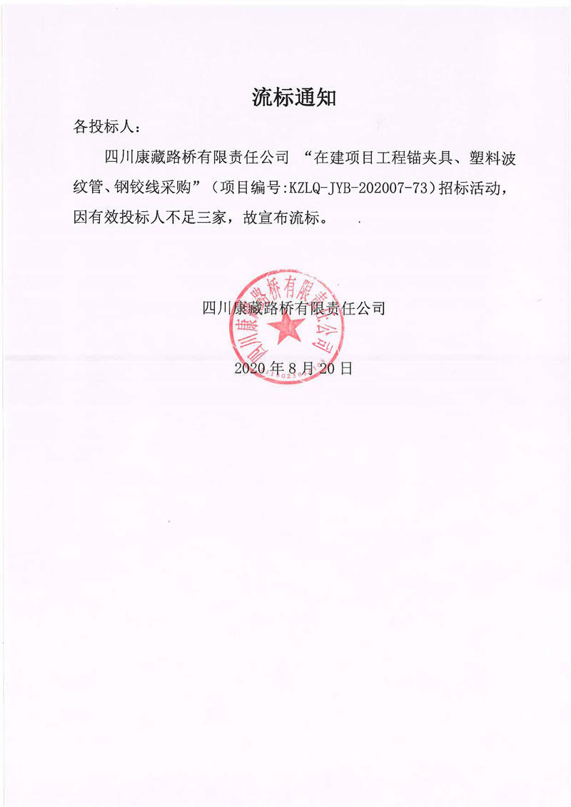 四川康藏路橋有限責(zé)任公司在建項(xiàng)目工程錨夾具、塑料波紋管、鋼鉸線(xiàn)采購(gòu)流標(biāo)通知