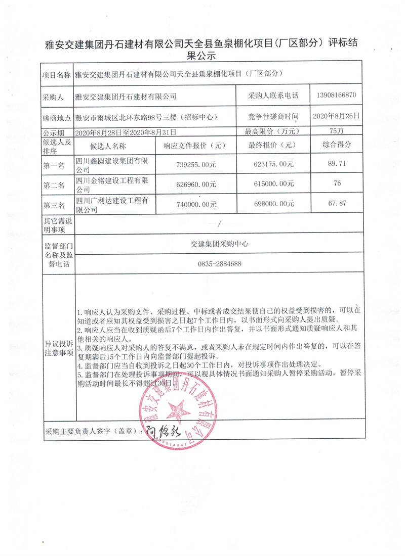 雅安交建集團丹石建材有限公司天全縣魚泉棚化項目(廠區(qū)部分)評標結(jié)果公示