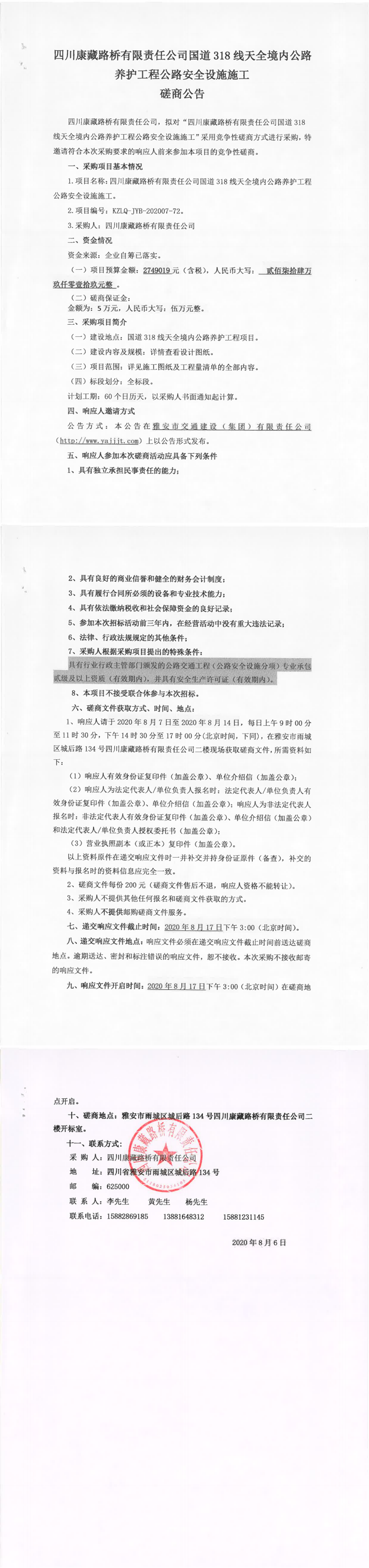 四川康藏路橋有限責(zé)任公司國(guó)道318線天全境內(nèi)公路養(yǎng)護(hù)工程公路安全設(shè)施施工磋商公告