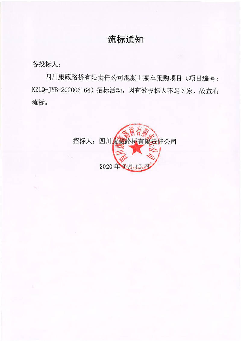 四川康藏路橋有限責任公司混凝土泵車采購項目流標通知