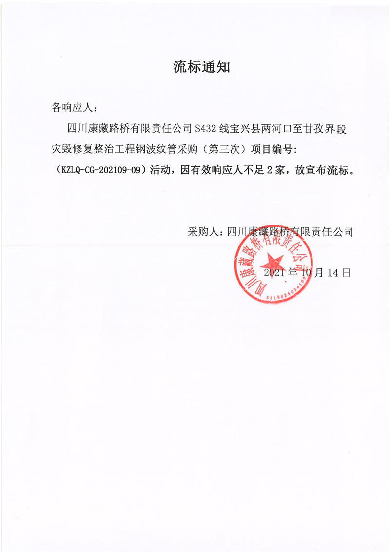 四川康藏路橋有限責(zé)任公司S432線寶興縣兩河口至甘孜界段災(zāi)毀修復(fù)整治工程鋼波紋管采購(第三次)競(jìng)價(jià)公告